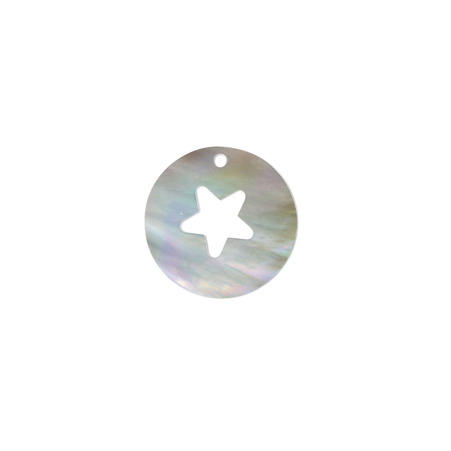 Drop, black lip shell (natural), 15mm round with cutout star, Mohs hardness 3-1/2. Sold individually.