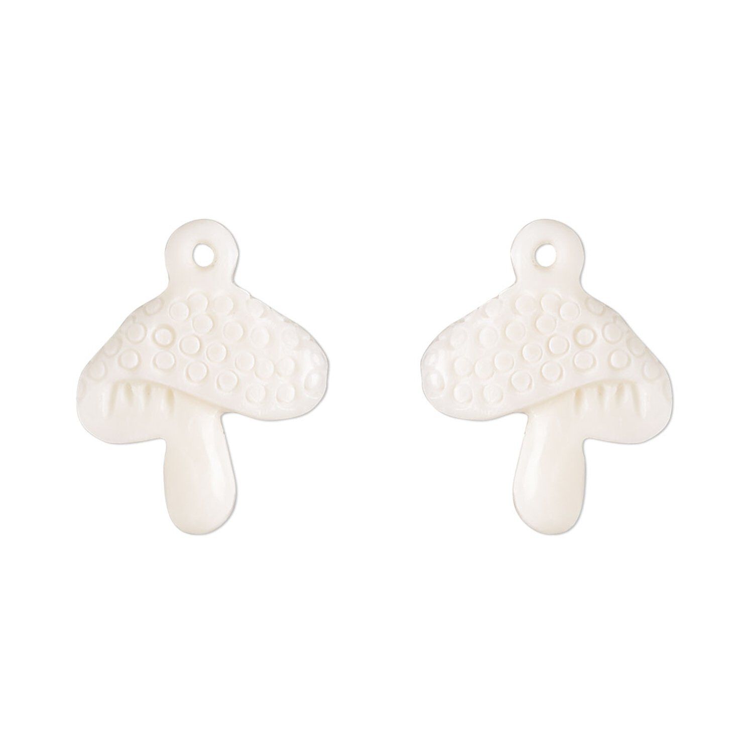 Drop, bone (bleached), 15x15mm left- and right-facing hand-cut top-drilled single-sided carved mushroom. Sold per pair.