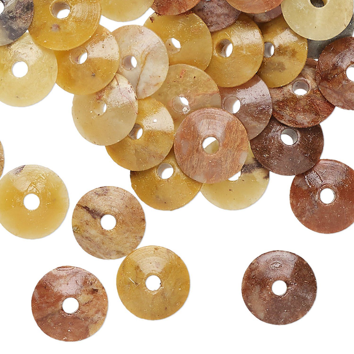 Let the natural beauty of hand-carved soapstone rondelle beads inspire your creativity. Each piece tells its own story through unique patterns and a spectrum of earthy hues, from warm tans and browns to touches of black, green and reddish. No two beads are exactly alike, making your designs truly one-of-a-kind. Ideal for low-impact creations like necklaces and earrings, these soapstone beads are clear-coated for added luster, polish and durability. Just remember to treat them with care, away from pressure or hard surfaces, to preserve their natural beauty.