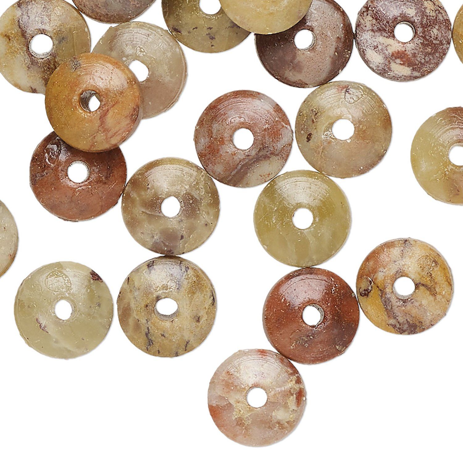 Let the natural beauty of hand-carved soapstone rondelle beads inspire your creativity. Each piece tells its own story through unique patterns and a spectrum of earthy hues, from warm tans and browns to touches of black, green and reddish. No two beads are exactly alike, making your designs truly one-of-a-kind. Ideal for low-impact creations like necklaces and earrings, these soapstone beads are clear-coated for added luster, polish and durability. Just remember to treat them with care, away from pressure or hard surfaces, to preserve their natural beauty.
