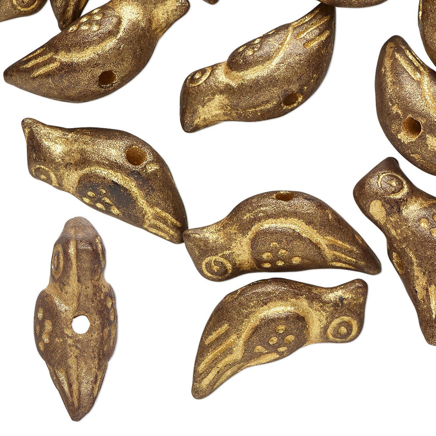 Bead, pressed clay, brown with gold, 19x7mm-21x9mm handmade bird. Sold per pkg of 20.