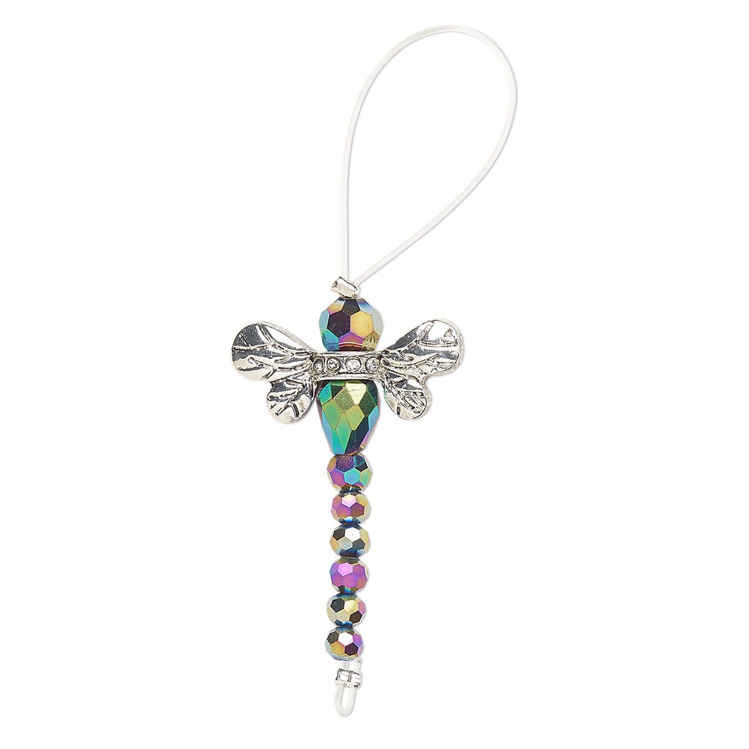 Temporarily strung on cording for you to unstring and place on head pins, wire or other stringing material in jewelry designs, this dragonfly features glass beads and rhinestone wings. Dragonflies are popular symbols in jewelry, often associated with positive change, self-realization and light-heartedness.