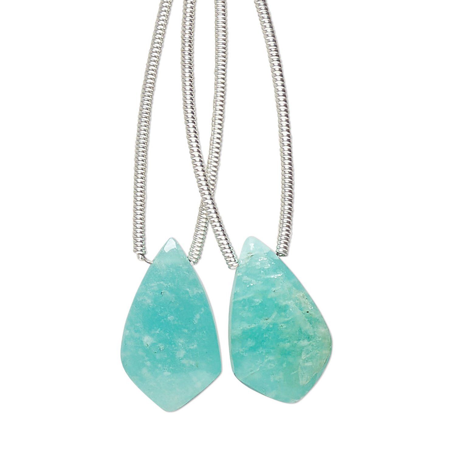Amazonite, sometimes called "Amazon stone," is known for its semi-opaque blue-green colors. Formed from a variety of microcline feldspar, amazonite can range from light green to greenish blue to deep blue-green shade. May include milky-white and tan cloudiness or streaking. Gorgeous hand-cut gemstone drops are available in packages of 2, ideal for creating earrings or matching on strung designs. Beads are temporarily strung with silver-plated copper spacers to protect against chipping and coordinating tassels at the end for a pleasing display. Sizes, shapes and colors may vary.