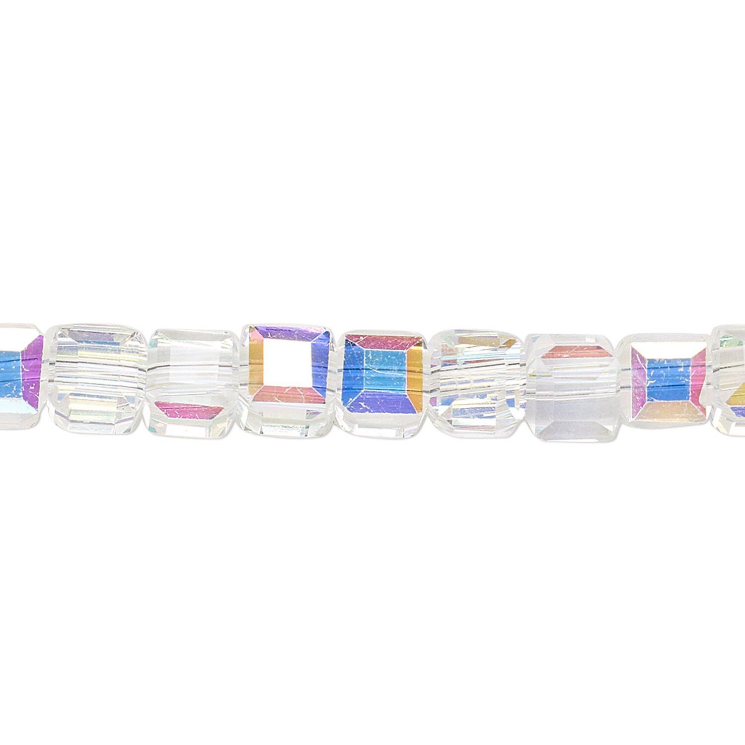 Small cube beads in a transparent clear color with an iridescent AB (aurora borealis) coating. Squares are a popular shape for their use in holiday designs such as present boxes and snowman hats. Machine-cut facets reflect lively highlights and eye-catching color. Colors, shapes and sizes may vary slightly due to different dye lots and cutting techniques.