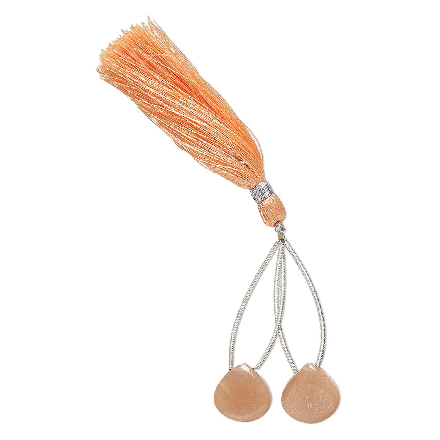 Peach moonstone varies in intensity from peach to light orange in color. This material has the moving iridescent sheen indicative of moonstone and is generally opaque to semitransparent. Gorgeous hand-cut gemstone drops are available in packages of 2, ideal for creating earrings or matching on strung designs. Beads are temporarily strung with silver-plated copper spacers to protect against chipping and coordinating tassels at the end for a pleasing display. Sizes, shapes and colors may vary.