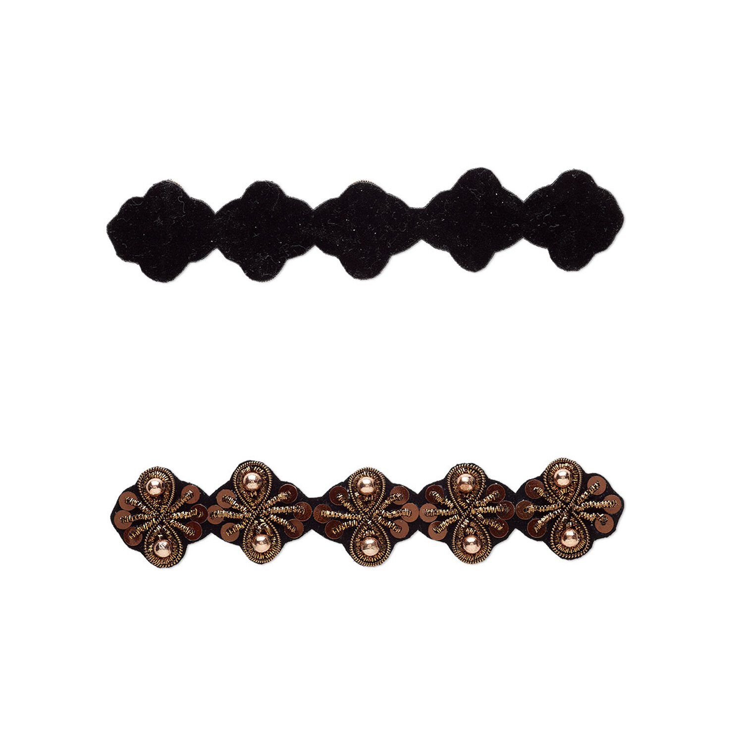 Sew-on component, velveteen / acrylic / acrylic pearl / copper-finished copper French wire, black / brown / metallic brown, 5-1/4 x 1 inch with fancy design. Sold individually.
