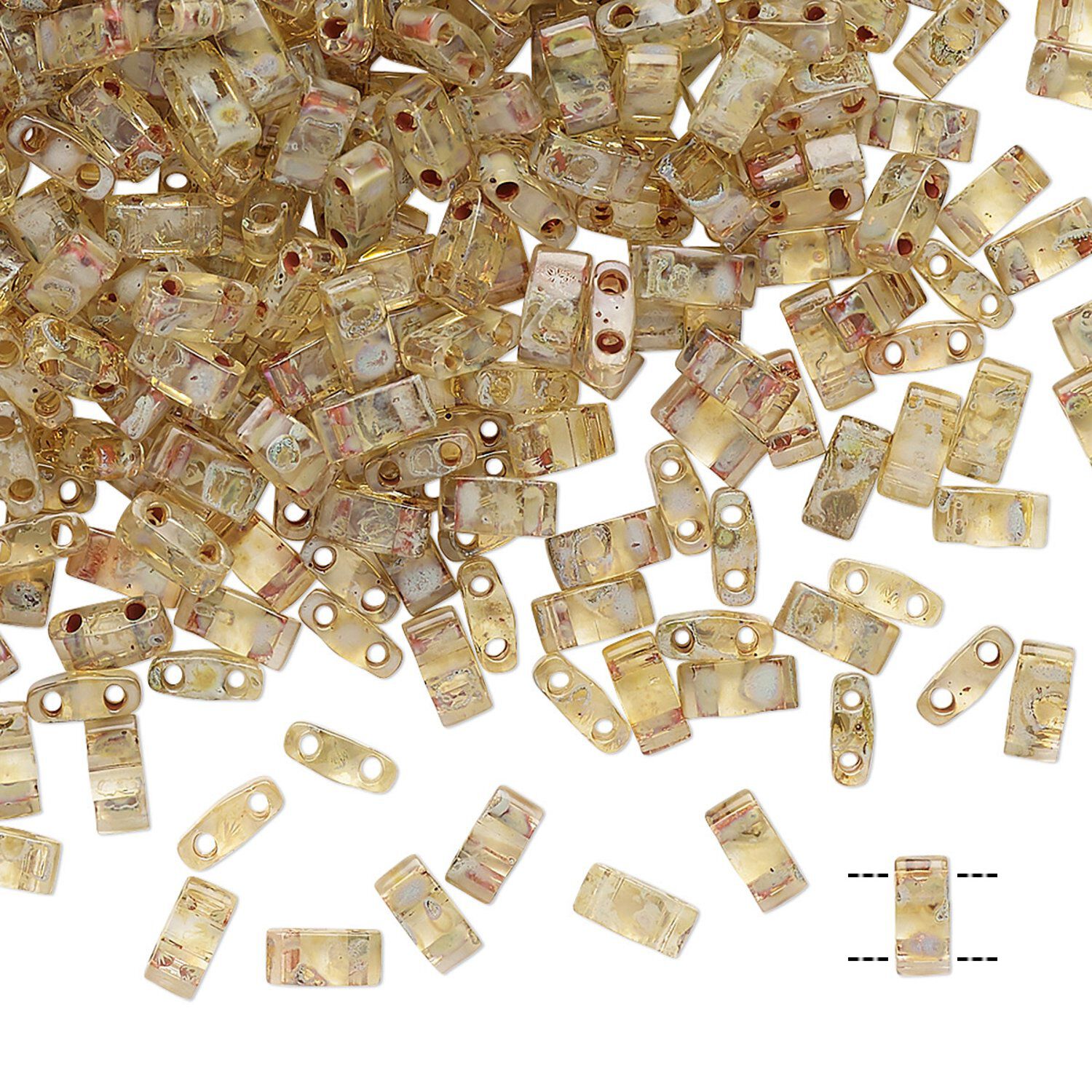 Narrow rectangle Half TILA (pronounced Tee-la) beads with a Picasso finish have dual beading holes and color coordinate with flat square TILA® beads. They are ideal for joining strands together, as spacer bars and to create designs with checkerboard and weaving patterns. The swirled effect gives each bead the look of marble--or the pattern of a Picasso painting. Made by Miyuki of Japan, makers of popular Delica® seed beads, TILA® beads are uniform in size and shape.