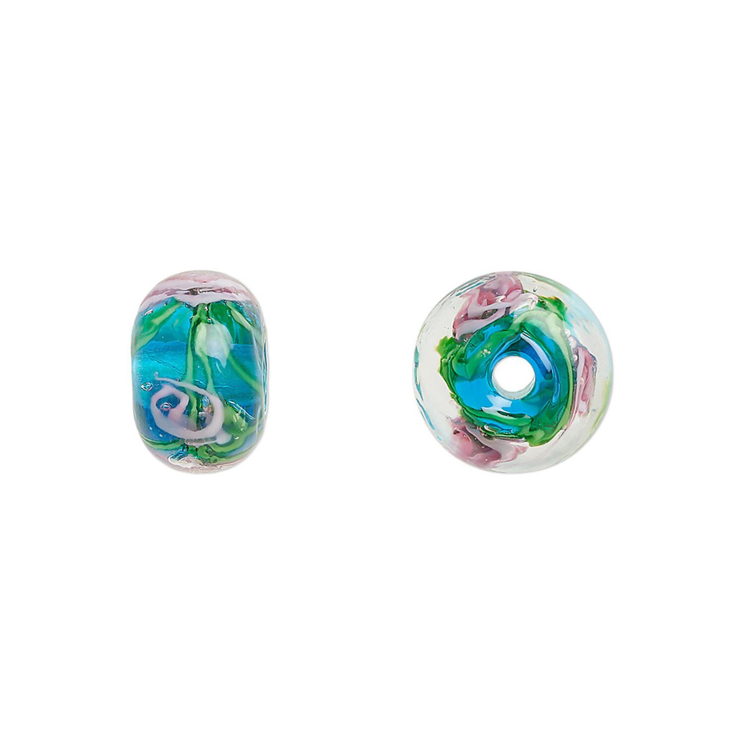 Bead, lampworked glass, opaque teal and multicolored, 12x8mm rondelle with rose. Sold per pkg of 4.