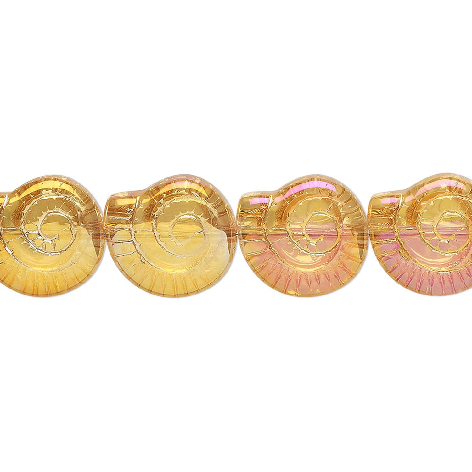 Bring a fresh ocean-inspired beauty and nautical whimsey to your projects with these translucent nautilus shell-shaped beads. The chambered nautilus is one of the oldest ocean dwellers. Its shell is seen by some as a symbol of nature's grace, growth, expansion and order amidst chaos. Glass is pressed for consistent size and shape. AB coating adds a play of color to the surface of the bead and can wear off.