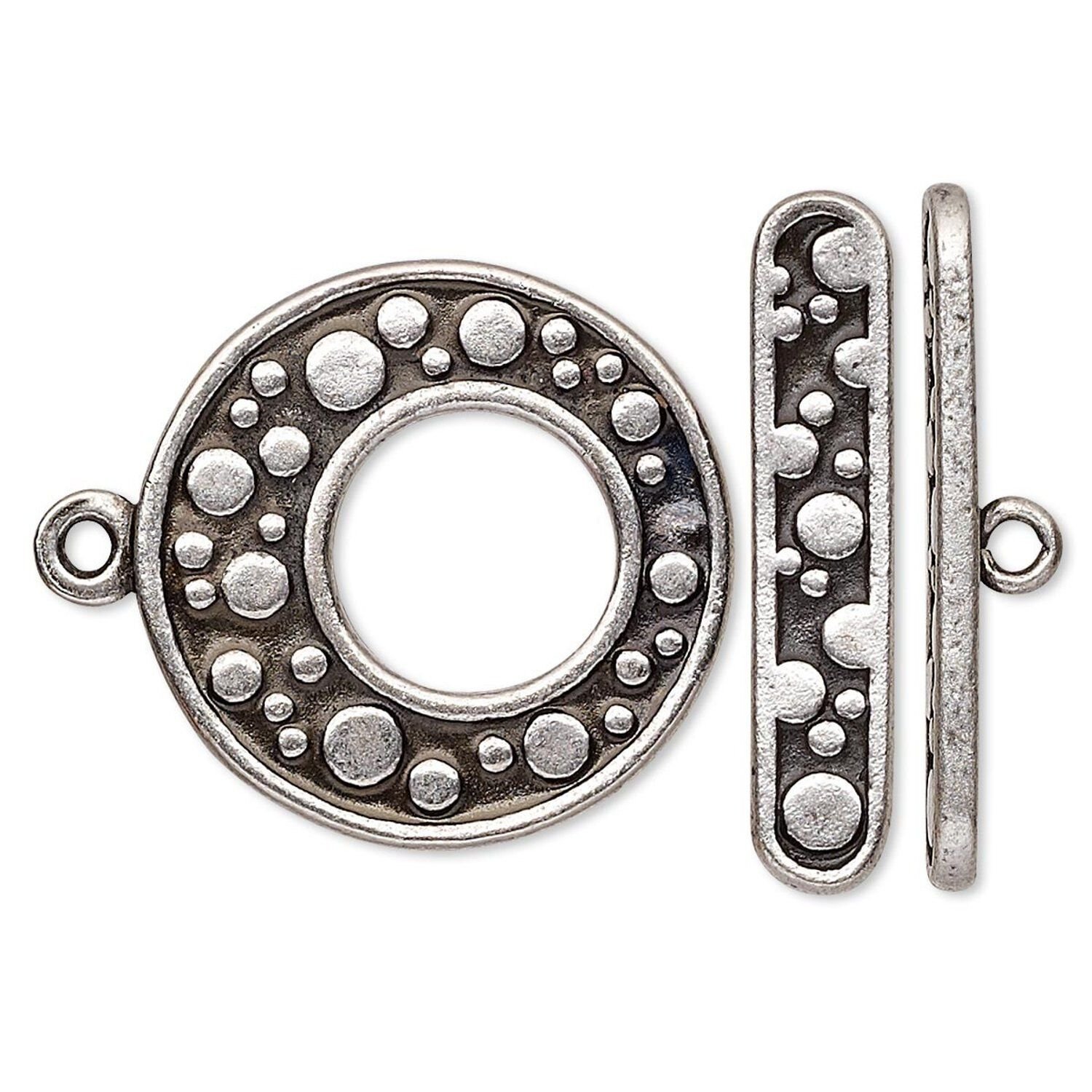 Themed pewter (tin-based alloy) toggle clasp works as a closure and jewelry design component--its form and function combine flawlessly to add lovely detail. Stringing hole is 2mm in diameter.