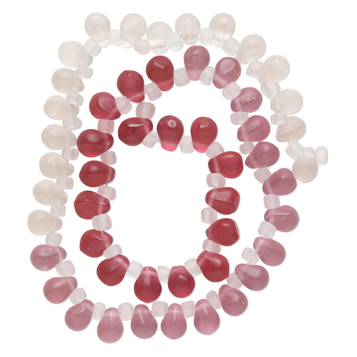 Bead, glass, translucent matte pale pink, light pink and dark pink, 8x6mm top-drilled teardrop with irregular rondelles. Sold per 14-inch strand.