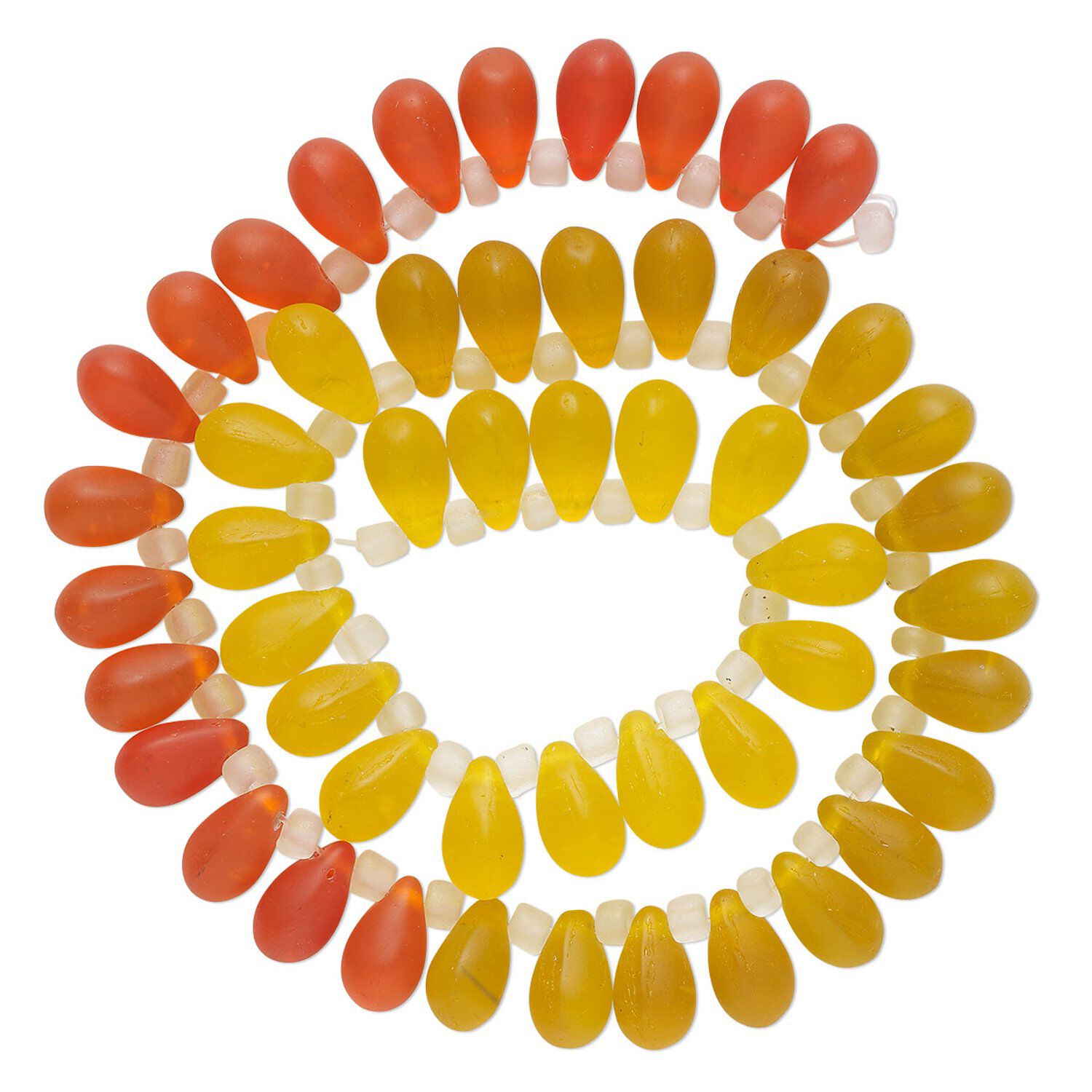 Bead, glass, translucent matte orange, light yellow and yellow, 11x7mm top-drilled teardrop with irregular rondelles. Sold per 14-inch strand.