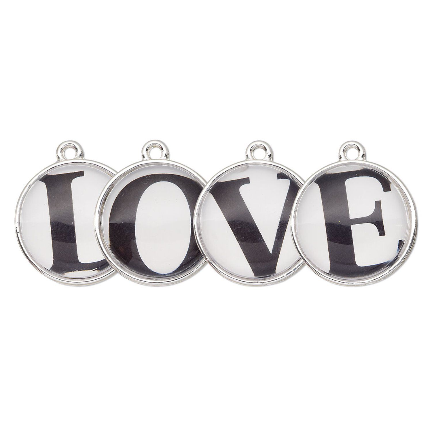 Drop, silver-finished "pewter" (zinc-based alloy) and plastic, black and white, 20mm single-sided domed flat round with "LOVE." Sold per 4-piece set.