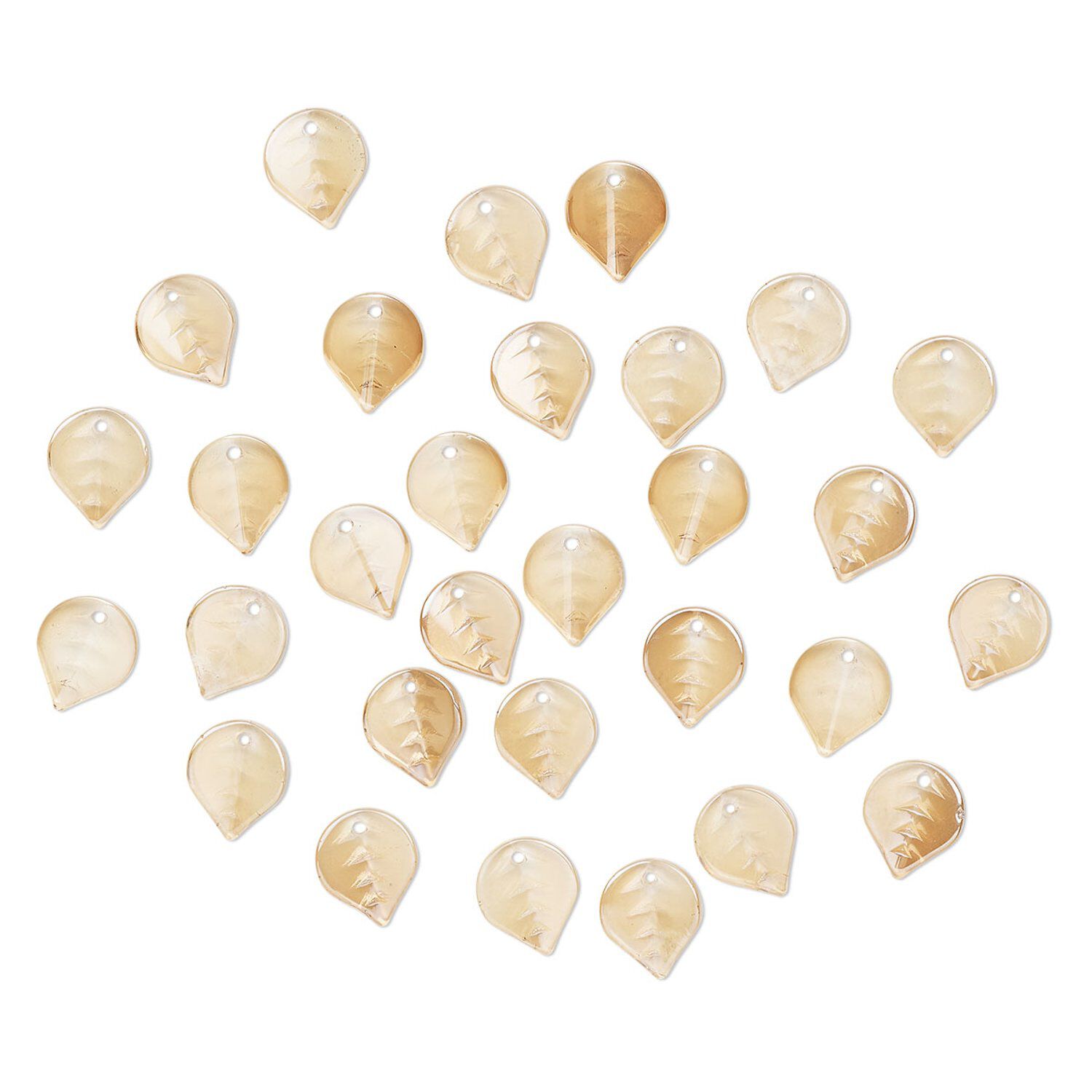Drop, pressed glass, translucent champagne luster, 12 x 10mm pressed leaf, top-drilled. Sold per pkg of 30.