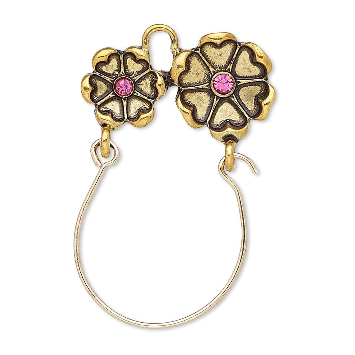 Focal, antiqued gold-finished "pewter" (zinc-based alloy) and steel / Czech glass rhinestone, pink, 37x24mm single-sided charm holder with 25x13mm flowers. Sold per pkg of 2.