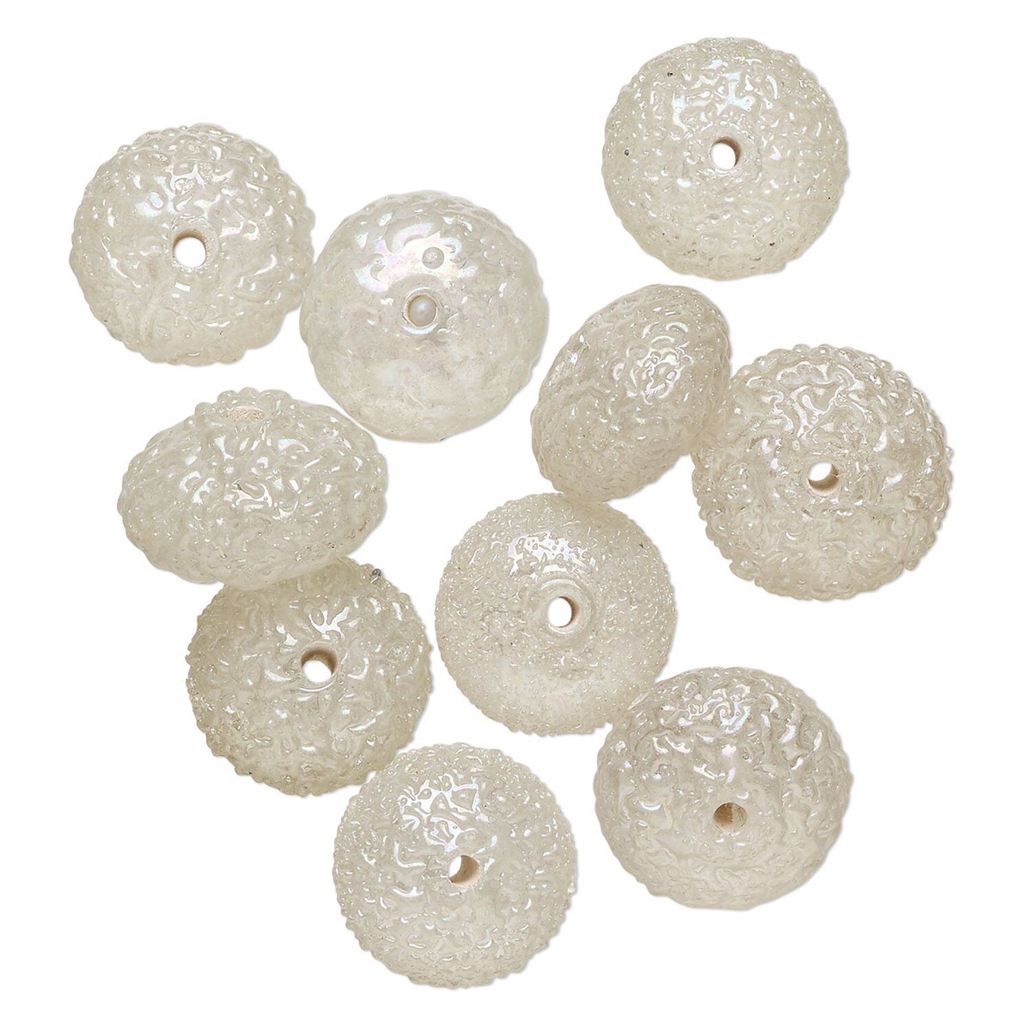 Bead, lampworked glass, translucent clear AB, 15x8mm textured rondelle. Sold per pkg of 10.
