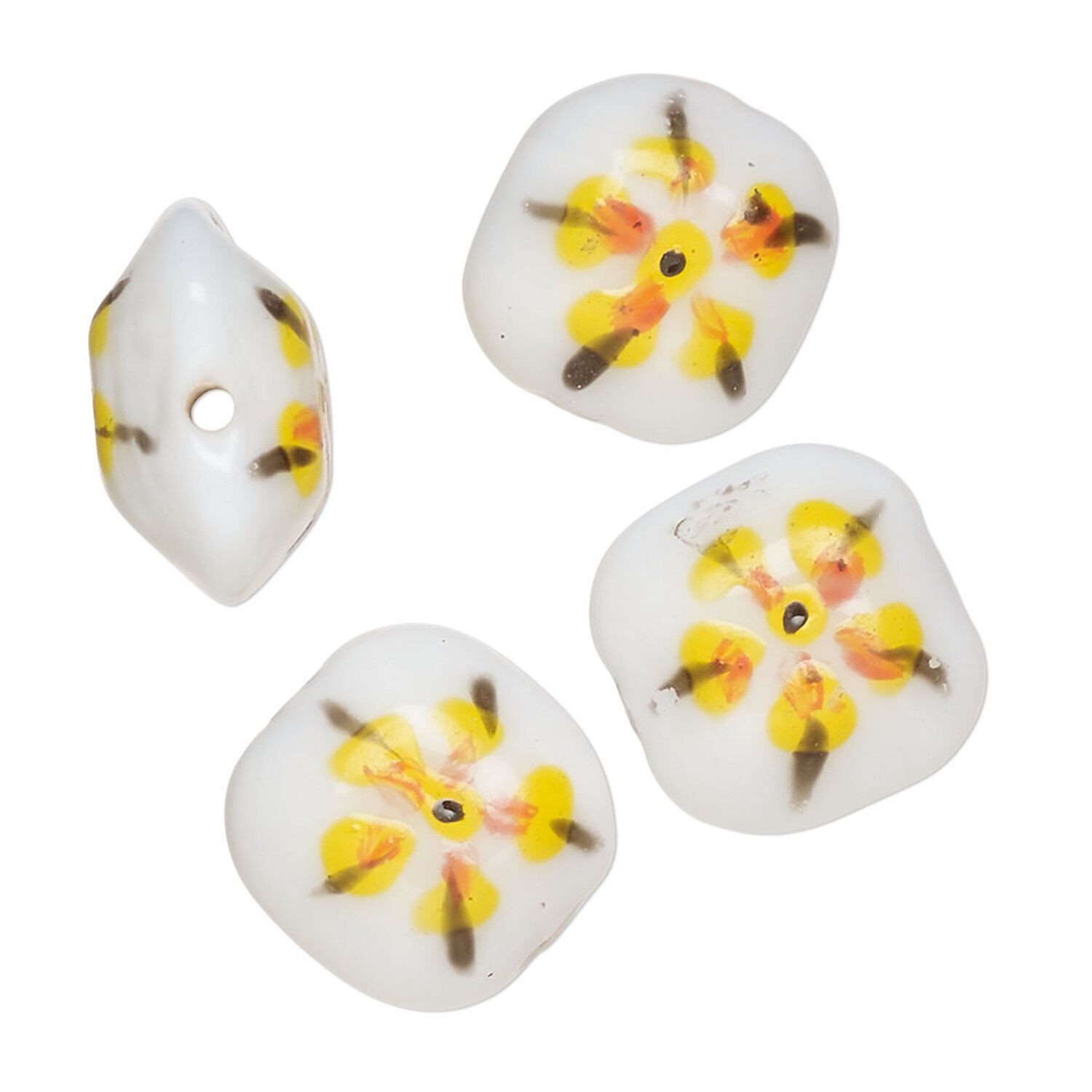 Bead, lampworked glass, opaque white / black / yellow, 17-16mm-14x13mm puffed rectangle with double-sided painted flower design. Sold per pkg of 4.