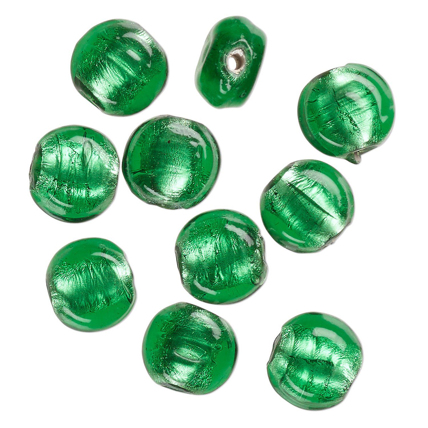 Bead, lampworked glass, opaque green, 12x7mm-10x6mm flat round with silver-colored foil. Sold per pkg of 10.