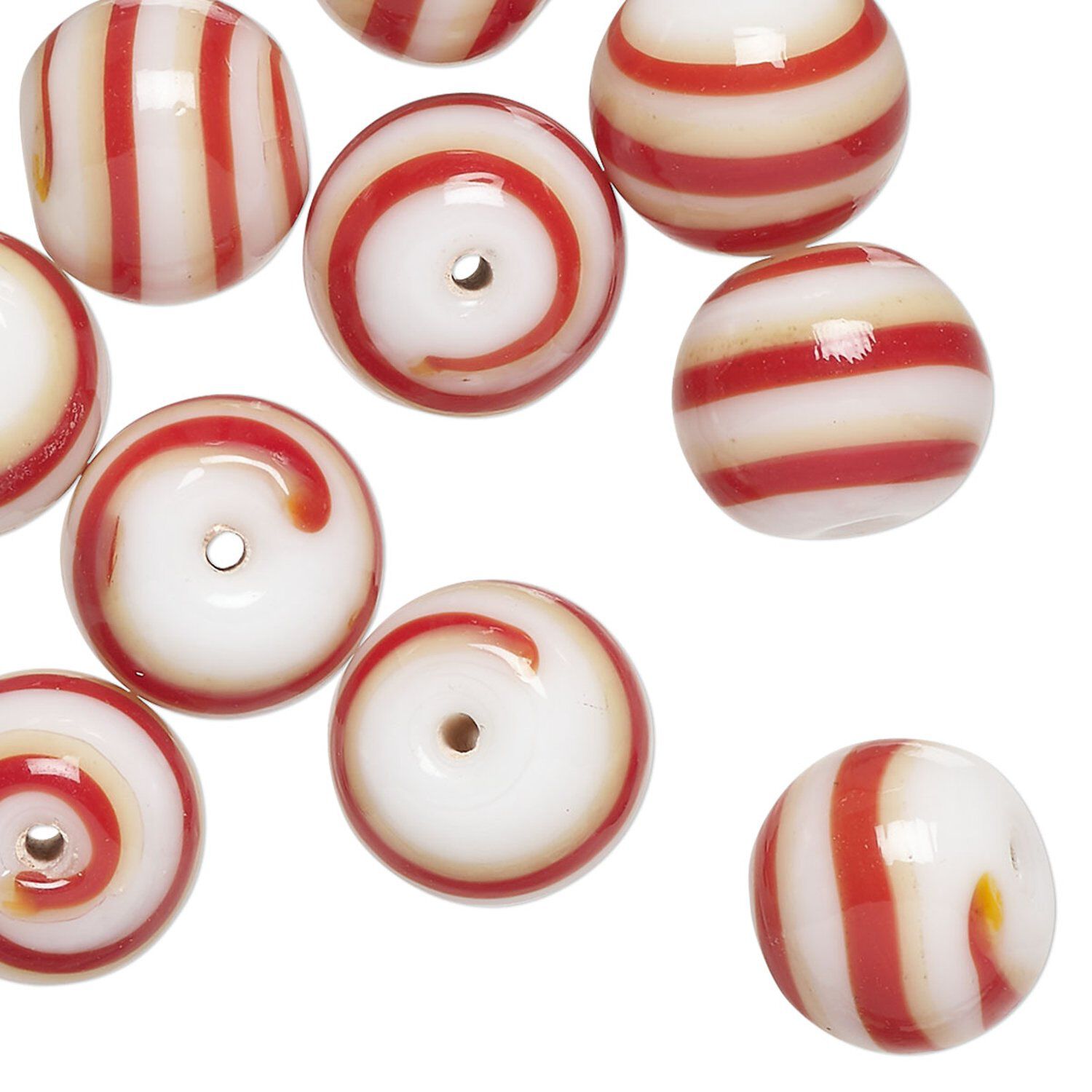 Resembling hard candy with their fun stripes of red and golden yellow on white, these beads will add sweet touch of playfulness to your next design.