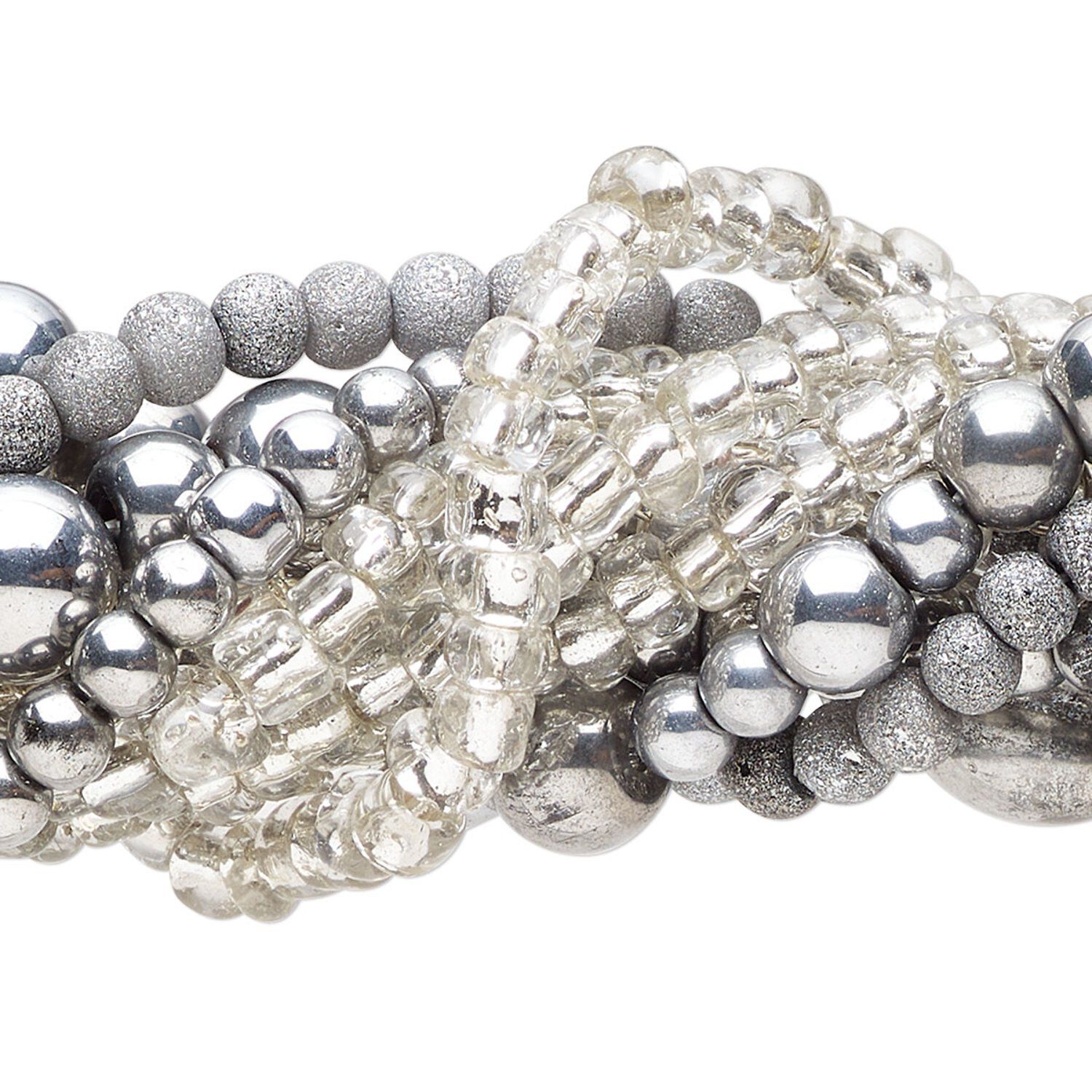 Create dazzling designs with this elegant bead mix, featuring a sophisticated range of silver-greys. Colors can include clear, frosted gray, silver-finished and silver-lined. Shapes can include round, rice, bicone and more.