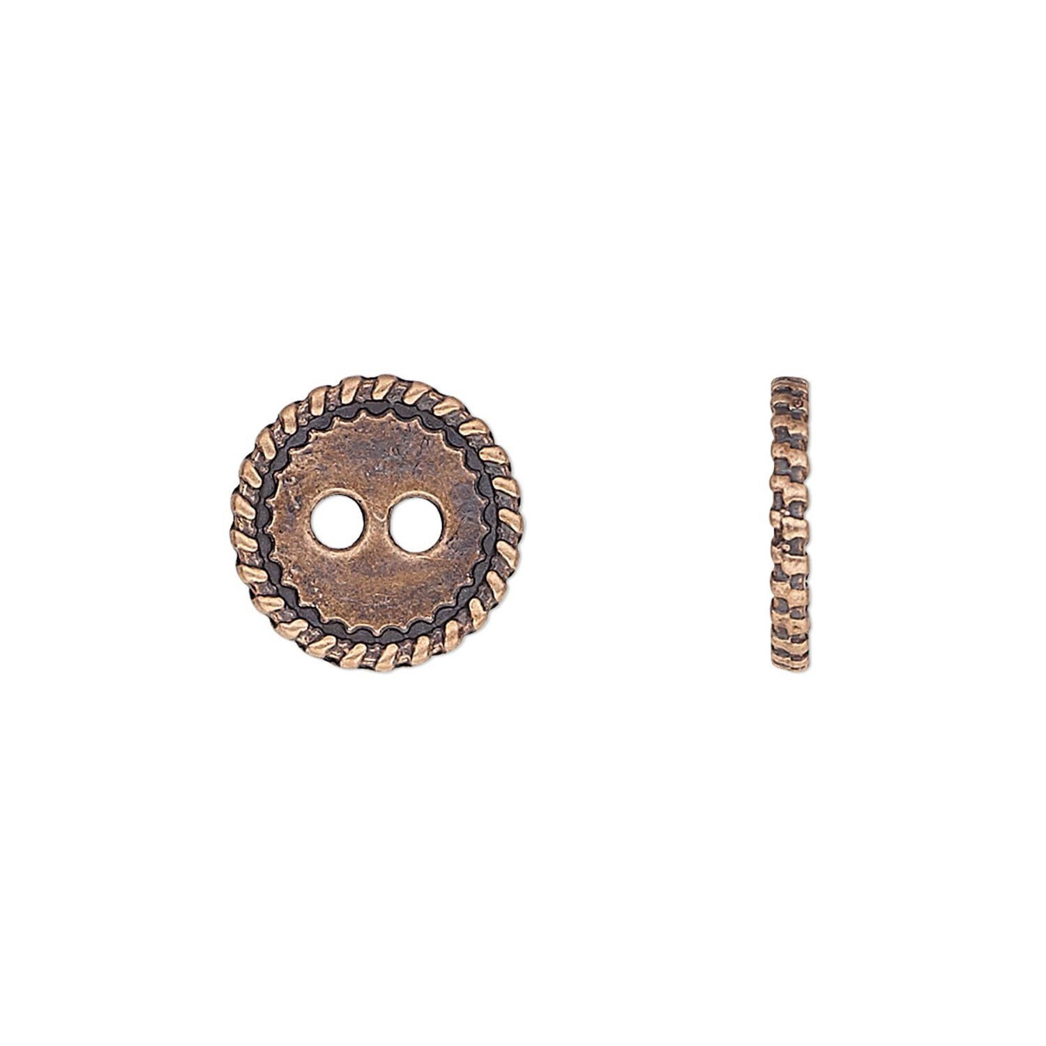 Button, antique copper-plated "pewter" (zinc-based alloy), 12.5mm double-sided flat round with rope edge. Sold per pkg of 50.