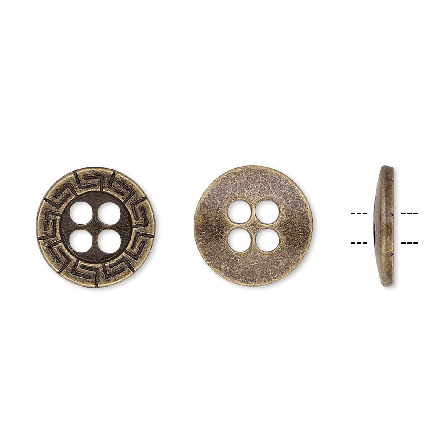 Button, antiqued brass-finished "pewter" (zinc-based alloy), 12mm single-sided flat round with Greek key design. Sold per pkg of 50.