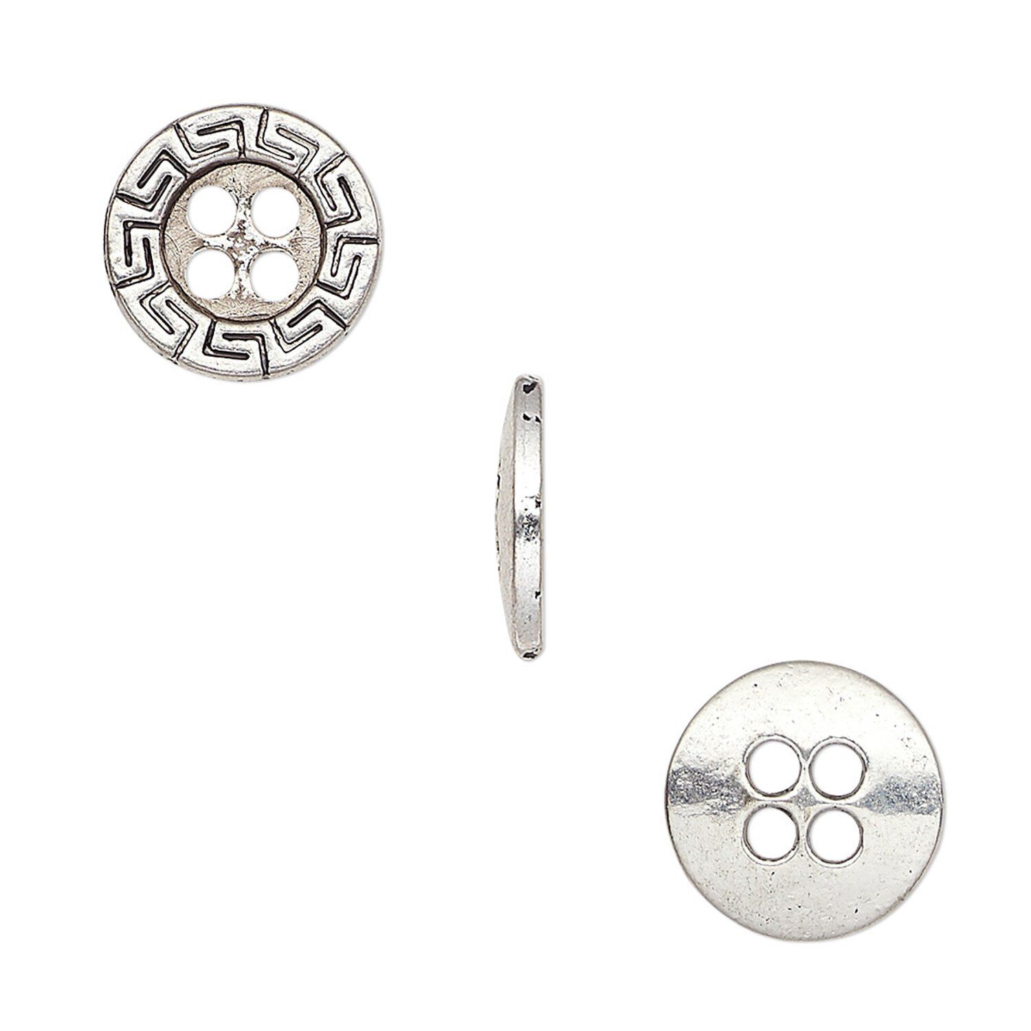 Button, antiqued silver-finished "pewter" (zinc-based alloy), 12mm single-sided flat round with Greek key design. Sold per pkg of 50.