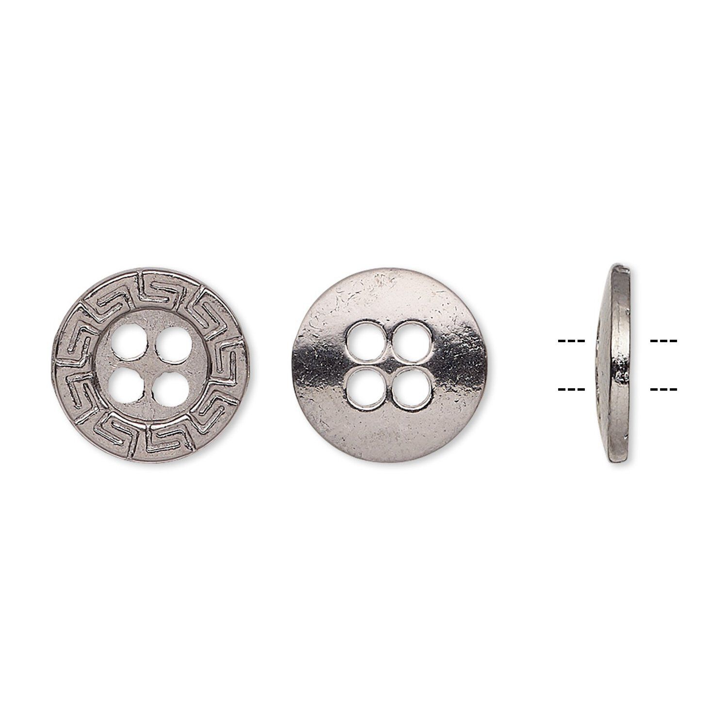 Button, gunmetal-finished "pewter" (zinc-based alloy), 12mm single-sided flat round with Greek key design. Sold per pkg of 50.