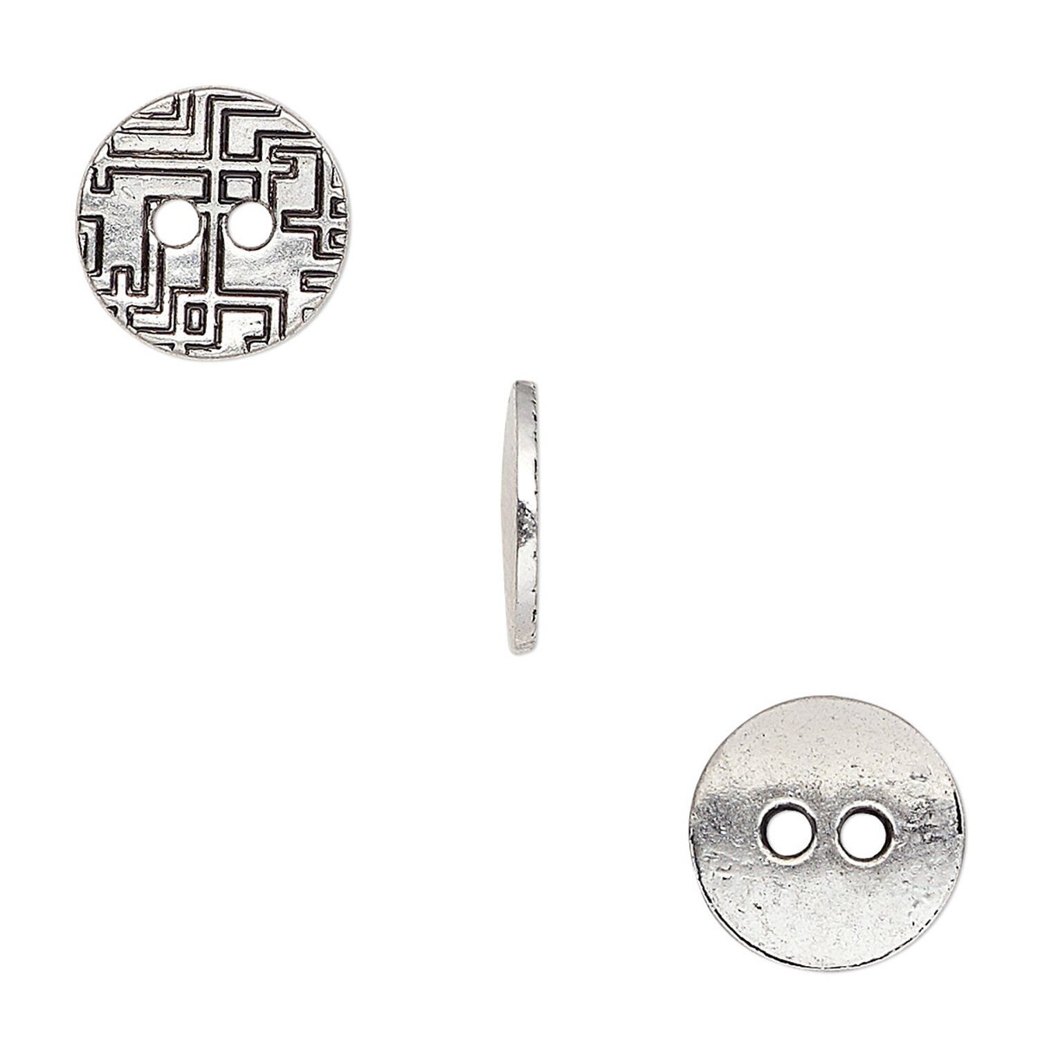 Button, antiqued silver-finished "pewter" (zinc-based alloy), 12mm single-sided flat round with geometric design. Sold per pkg of 50.