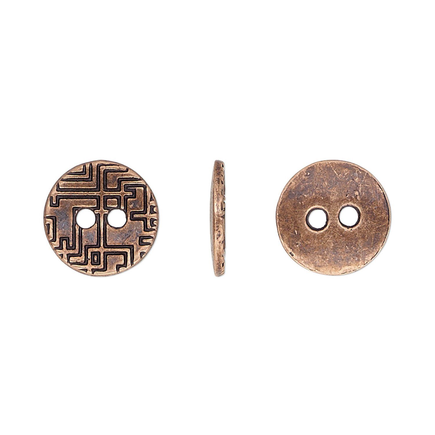 Button, antiqued copper-finished "pewter" (zinc-based alloy), 12mm single-sided flat round with geometric design. Sold per pkg of 50.