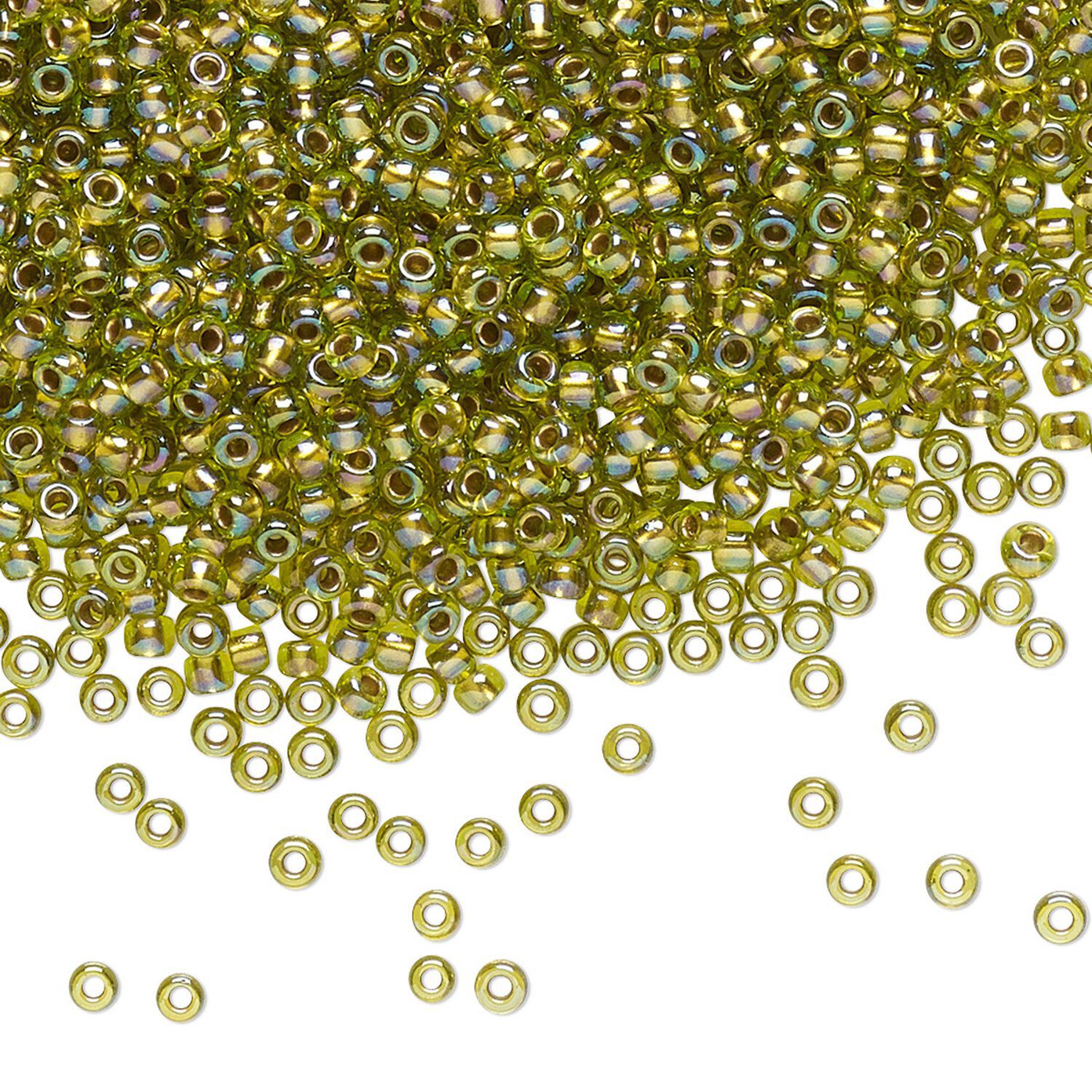 Seed bead, TOHO BEADS®, glass, pkg/7.5g, #11 round, translucent gold-lined rainbow peridot (TR-11-996).