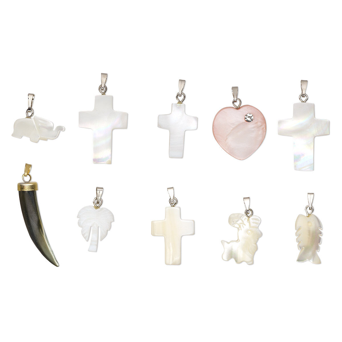 Colors can include dark salmon, light ocean blue, light salmon, burnt orange and more. Shapes can include flat heart, carved palm tree, cross, carved dog, carved elephant and more. Pendant bails are silver or gold-colored steel.