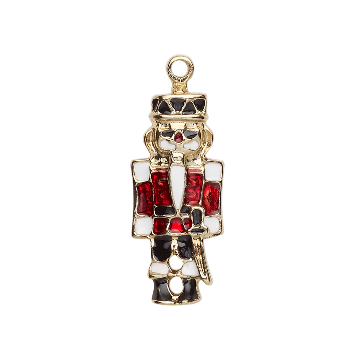 These Christmas nutcracker charms feature glossy enamel color, making them a cracking good choice for themed jewelry, miniature tree décor, seasonal gift embellishments and more. Charms are made from a "pewter" (zinc-based alloy) base with a gold finish. Colors can include tan, black, red and white.