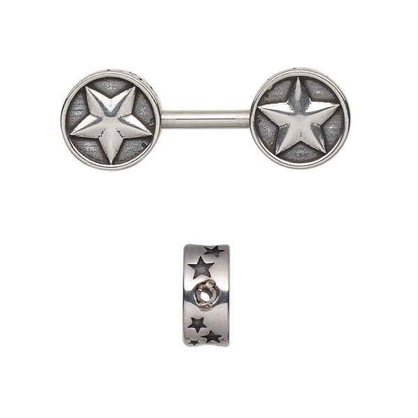Antiqued steel, round dumbbell bead with fun star design is popularly used as an addition to bracelets. Simply string the bead directly into your bracelet for a unique focal point. Stainless steel is loved for both its durability and beauty. Stainless steel resists rust, tarnish, oxidation and corrosion even in tropical or humid environments.