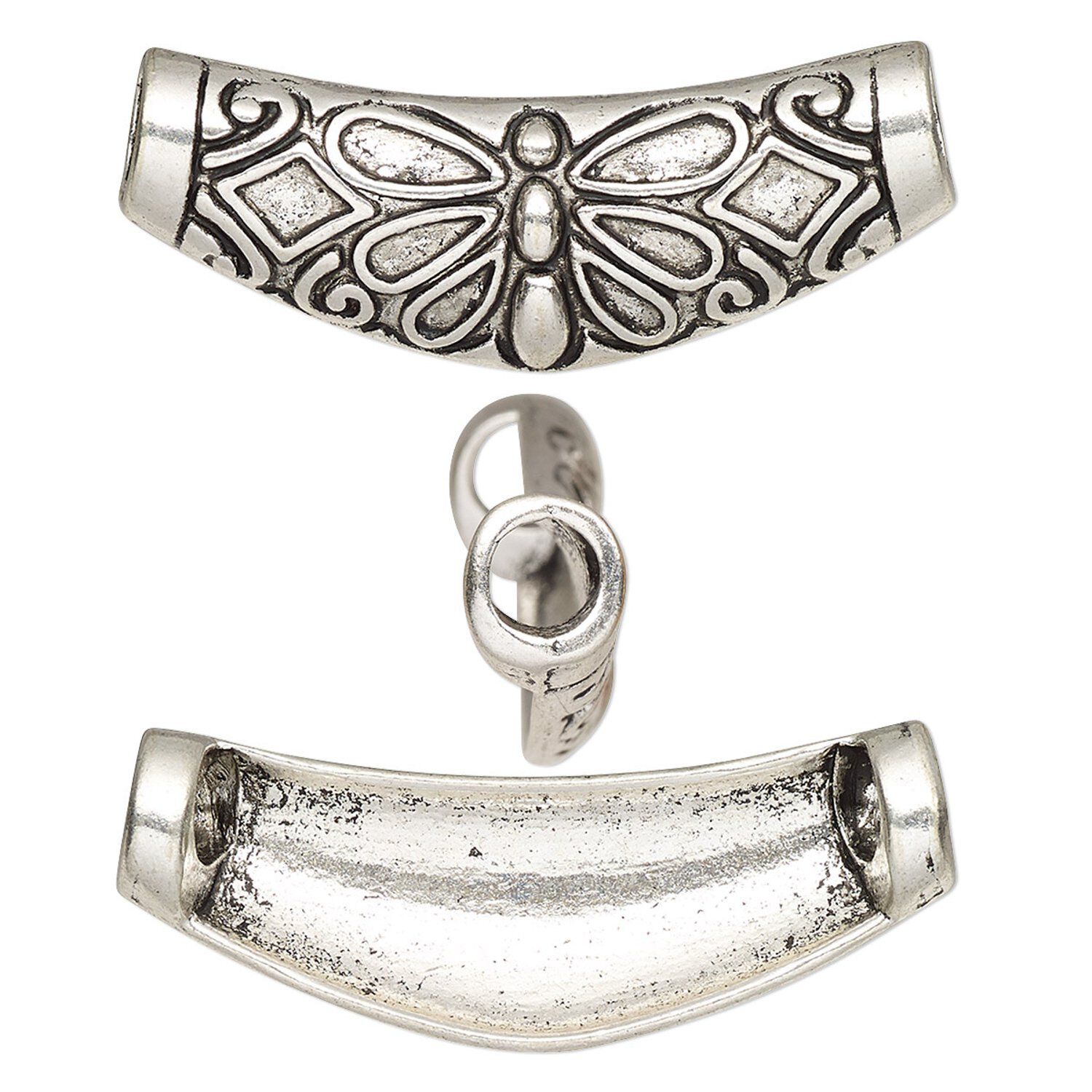 Give your jewelry aged beauty by including antique silver-finished slides. These curved tubes have a butterfly design across one side with an open back. This reduces their weight while not sacrificing beauty. The large 4mm hole allows for thicker cords, chains and multi-strand stringing material.