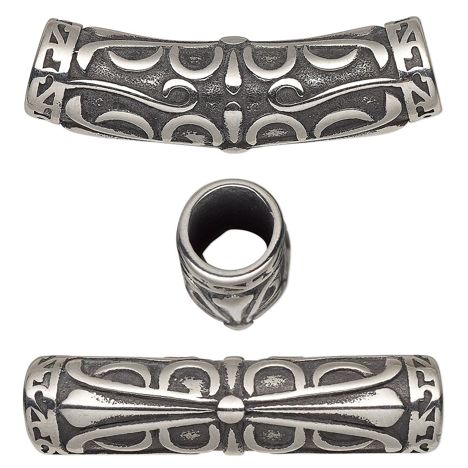 Antiqued stainless steel curved tube bead with ornate design is machine cast for consistent size and shape. The large drill hole accepts large diameter leather, cord and chain. Hand-polished stainless steel is resistant to rust, oxidization and discoloration and is ideal for wet, tropical environments.