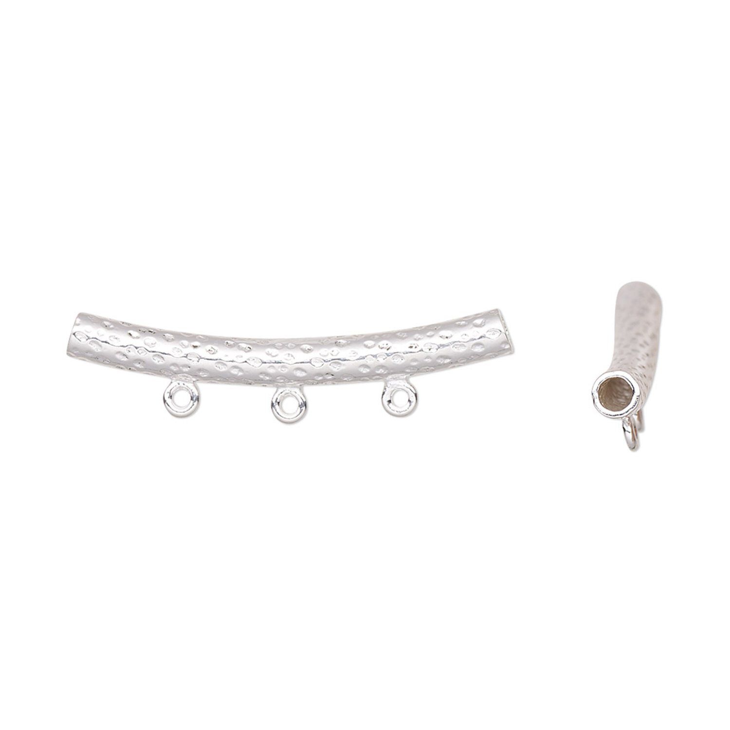 Slide leather cord, chain or other stringing materials through this curved, textured sterling silver tube bead to use as a component in jewelry designs. Ideal for necklaces and bracelets. Bead features three closed loops to add embellishments and has an anti-tarnish coating.