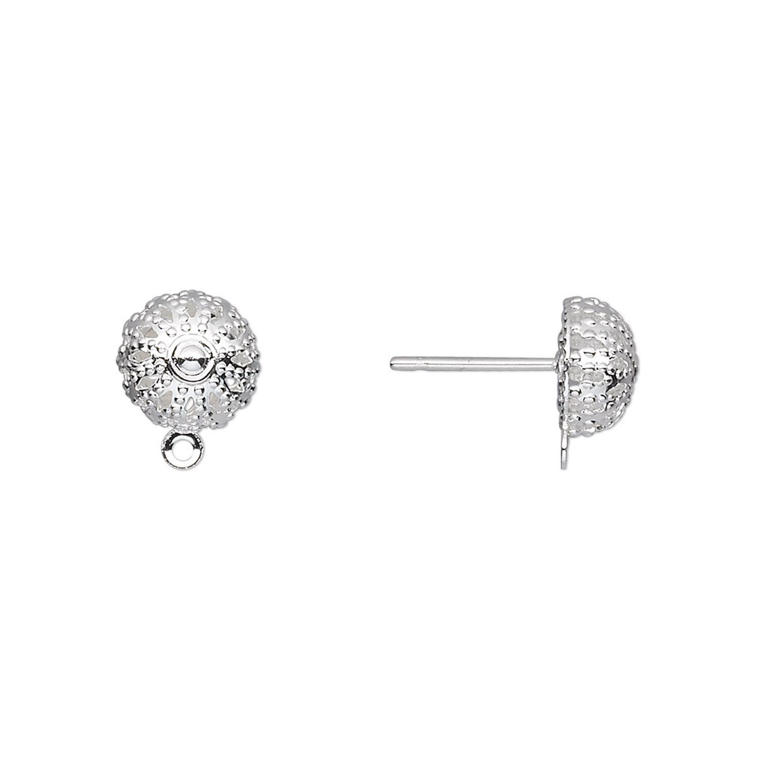 Earstud 1pkg100 silver-plated, 8mm filigree domed / closed loop, brass / stainless steel 50 pair