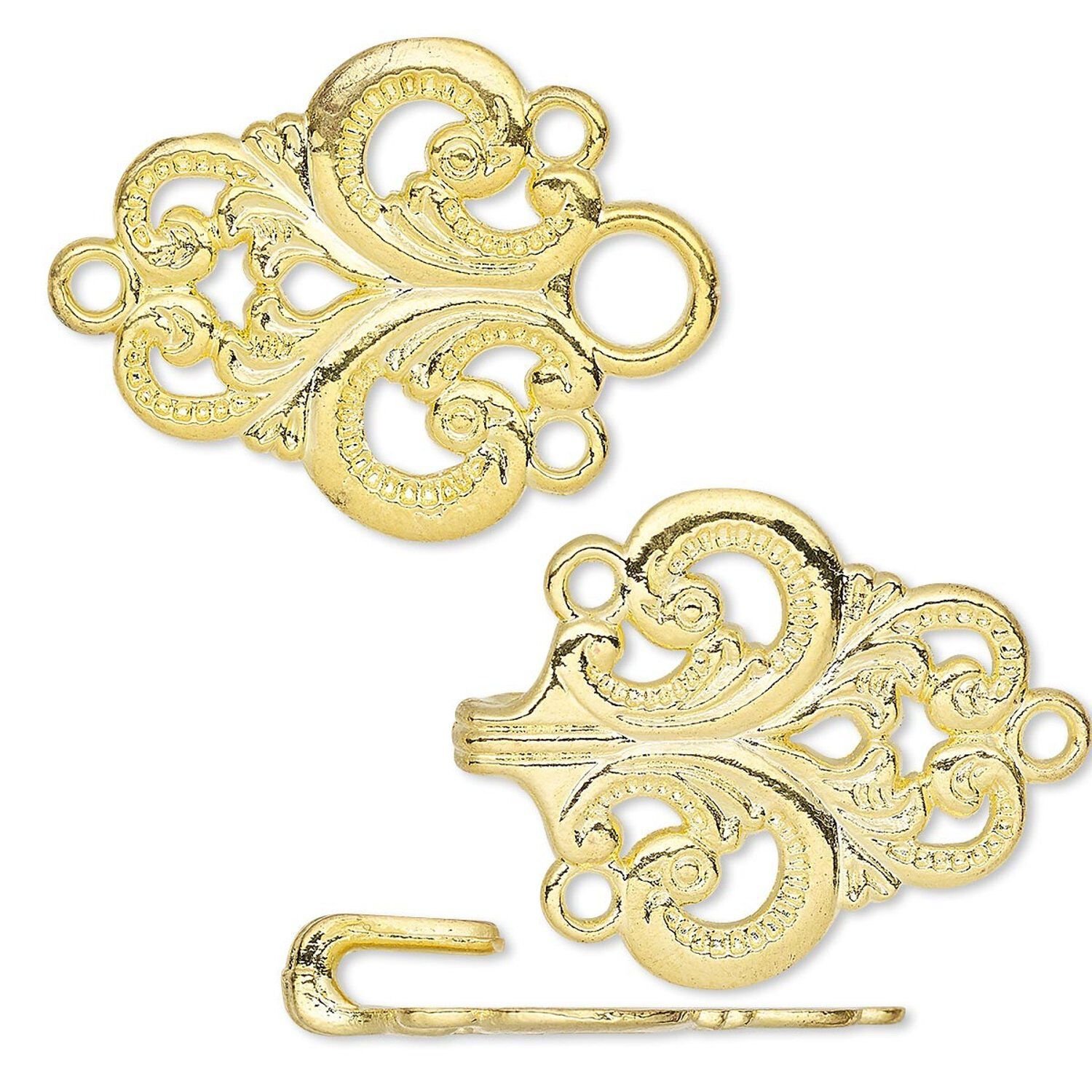Clasp, hook-and-eye, gold-finished "pewter" (zinc-based alloy), 59x28mm single-sided fancy. Sold individually.