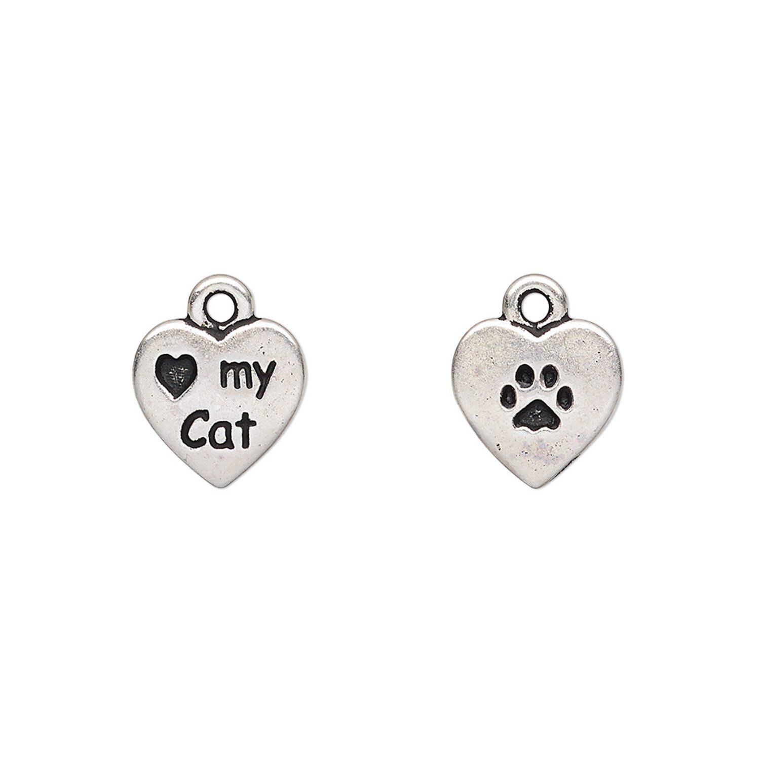 Antique silver-plated double-sided heart with "Love my cat" and paw print charm adds a signature look to jewelry designs. Loved for their affordability and precious-metal look, pewter (tin-based alloy) charms are lightweight and cost-effective alternatives to precious metal. All original designs, made in Greece and copyrighted by TierraCast®.