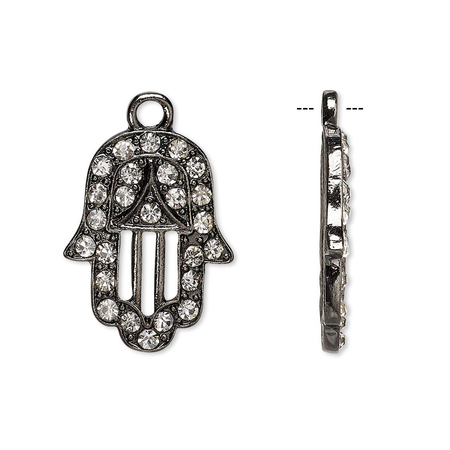 Painted "pewter" (zinc-based alloy) Hand of Fatima drop features faceted round Czech glass rhinestones. An amulet popular throughout the Middle East and North Africa, the Hand of Fatima (also called "hamsa/hamesh" or "Hand of Miriam") is believed to help ward off the evil eye.