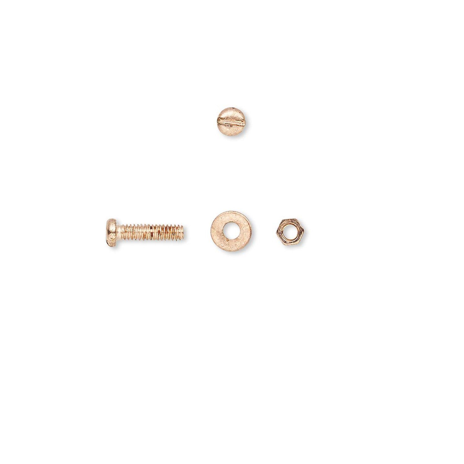 Micro hardware, copper-plated brass, 2.5x1.5mm nut / 4x0.5mm washer / 1/4 inch screw with 1.6mm thread diameter. Sold per pkg of 30.