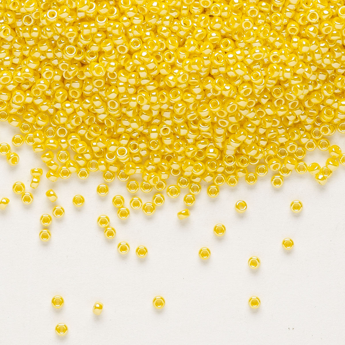 Seed bead, Miyuki, glass, pkg/35g, #15 rocaille, opaque luster canary, (RR-422D).