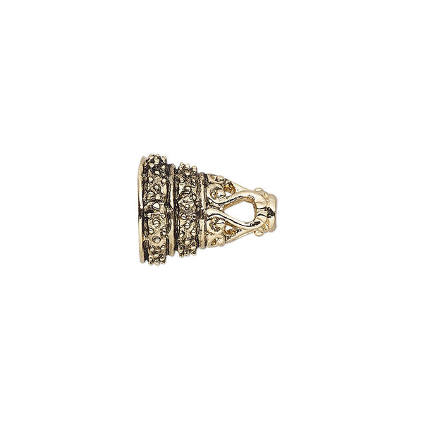 Cone, antique gold-finished bronze, 14.5x11.5mm textured, 8.5mm inside diameter. Sold individually.