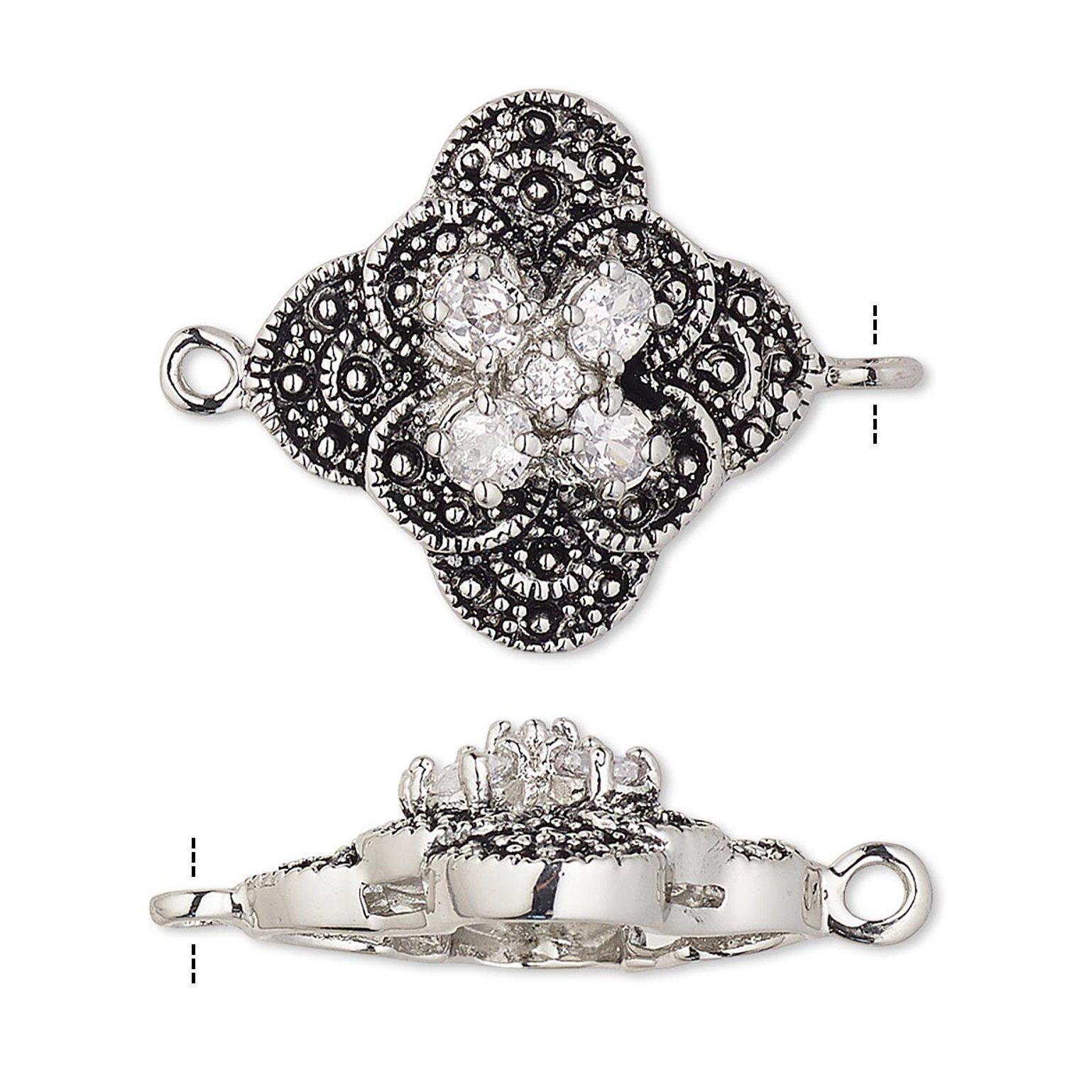 Link, cubic zirconia and antique silver-plated bronze, clear, 24x24mm single-sided fancy flower with 4x3mm faceted oval and 2mm faceted round. Sold individually.