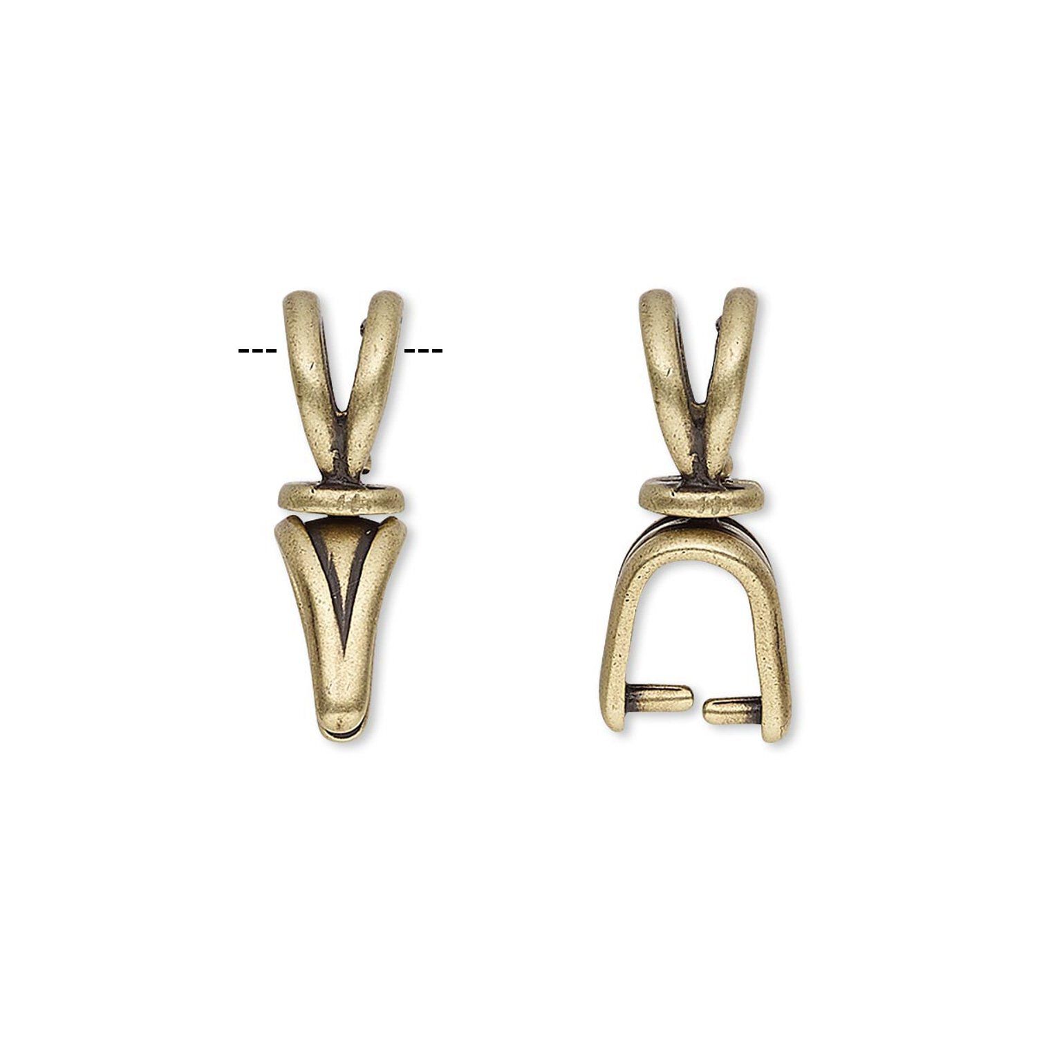 Bail, JBB Findings, ice-pick, antique brass-plated pewter (tin-based alloy), 19x5mm double-sided shield with lines and swivel, 6mm grip length. Sold individually.