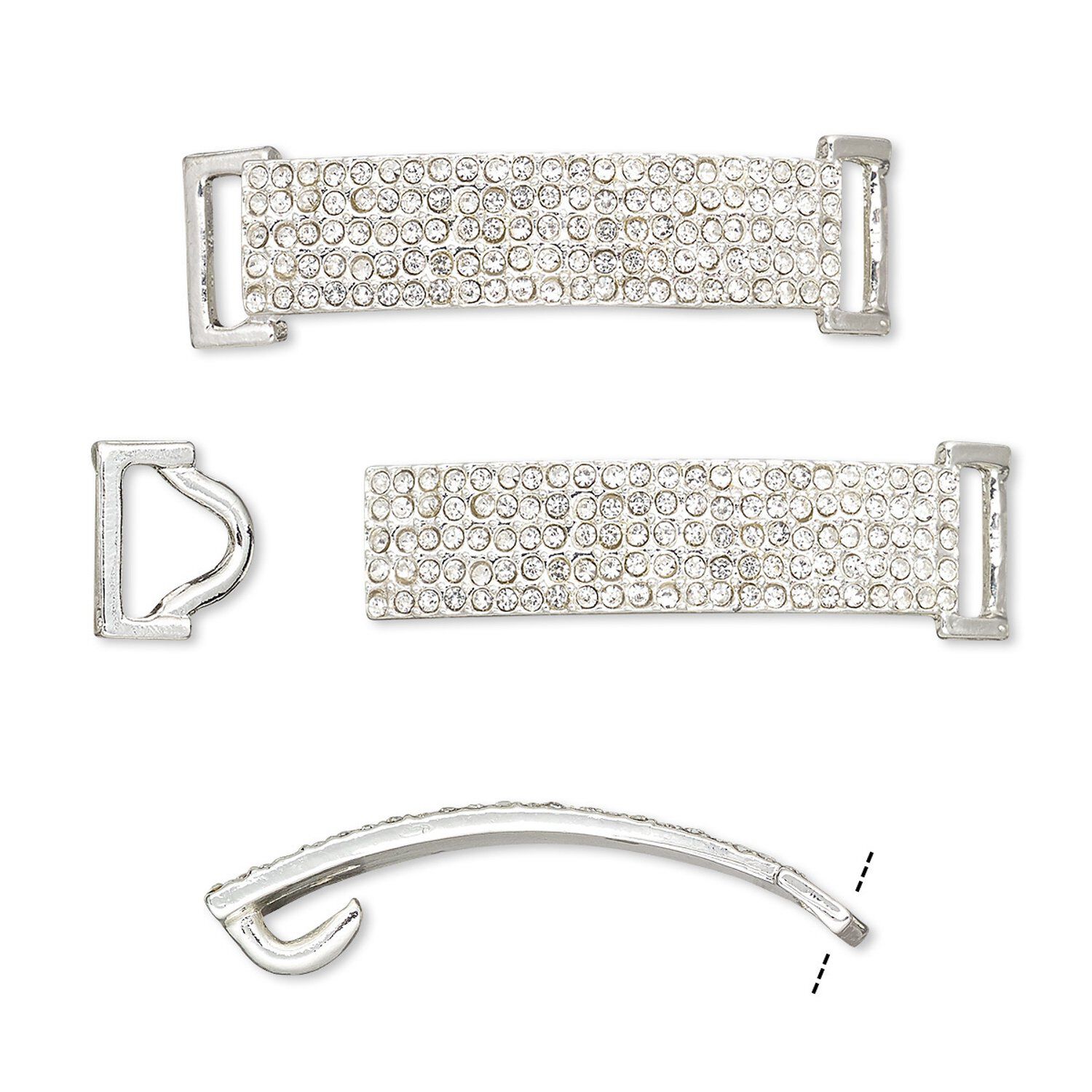 Clasp, hook-and-eye, glass rhinestone and silver-finished "pewter" (zinc-based alloy), clear, 49x13mm single-sided curved rectangle, 10x3.5mm inside diameter. Sold per 2-piece set.