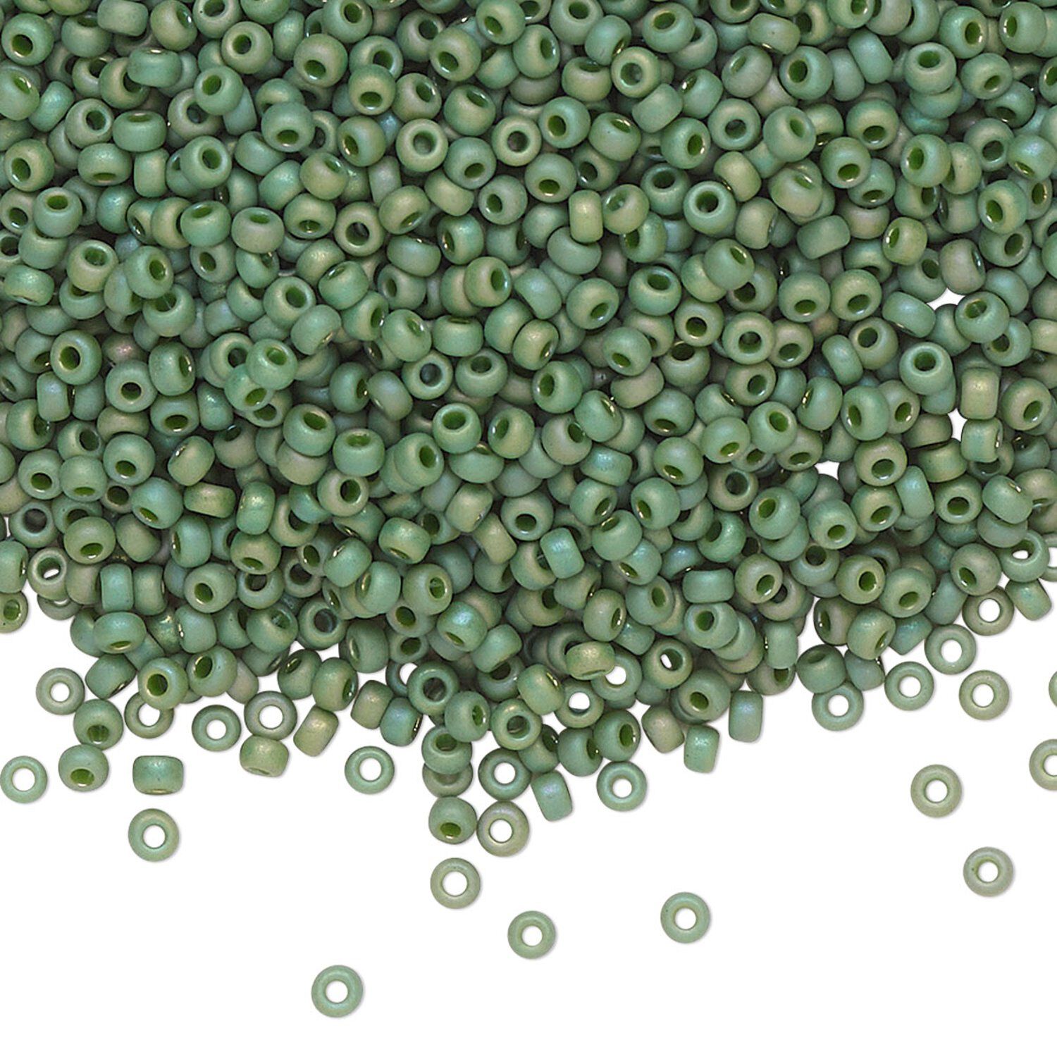 Seed bead, Miyuki, glass, pkg/25g, #11 rocaille, opaque matte rainbow basil green, (RR-4700).