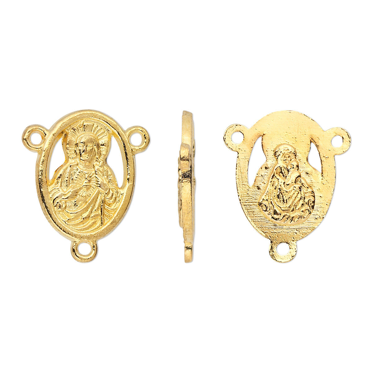 Gold-finished connectors are designed as rosary centers or links. Front of connector includes a Sacred Heart of Jesus and a Madonna with Christ Child on back.