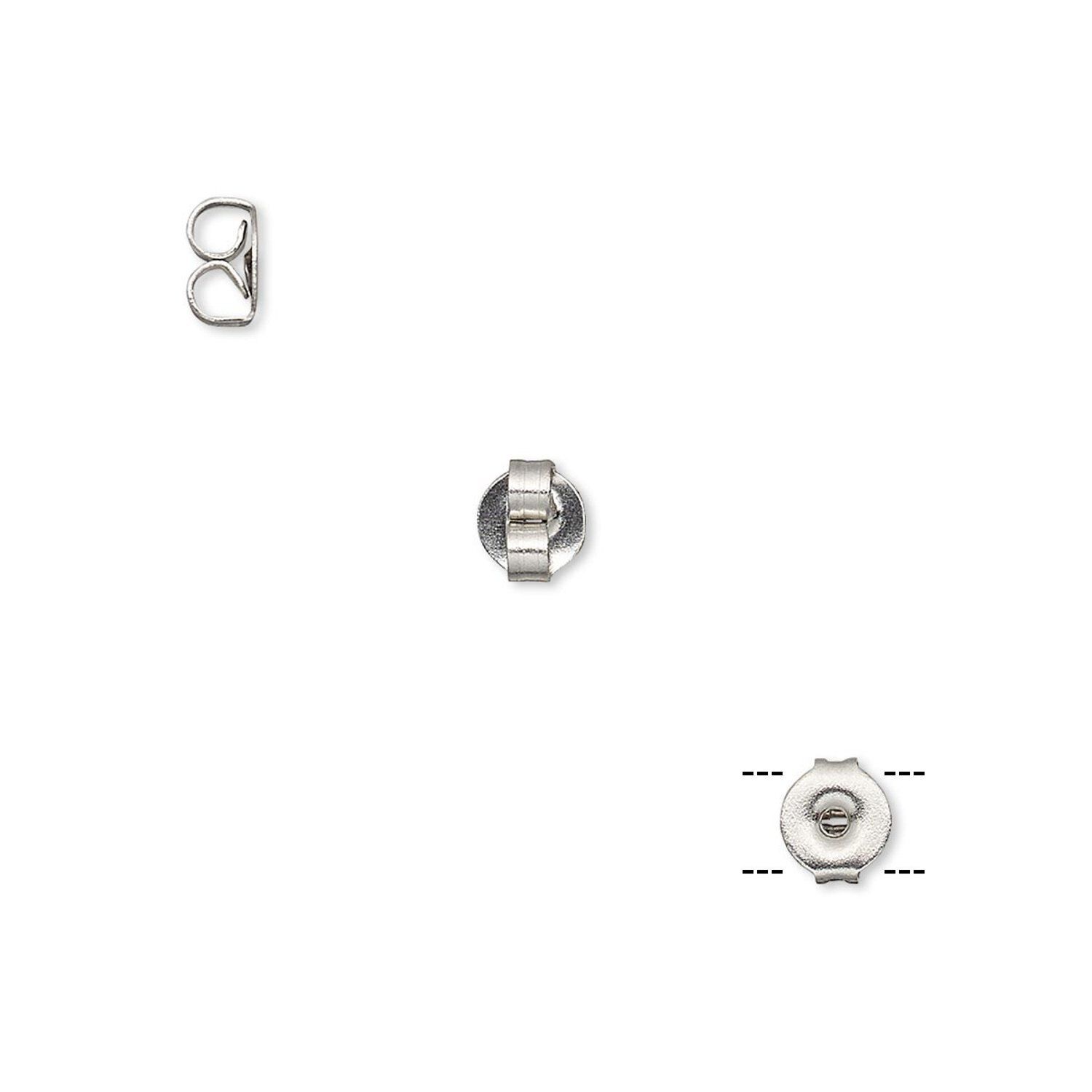 Machine-made stainless steel "butterfly clutch" earnuts are held on by friction and used with most earpost styles. 316L stainless steel alloy resists rust, tarnish, oxidation, discoloration and corrosion. It is ideal for humid zones, moist environments and tropical areas. It will not oxidize in display cases or during wear.